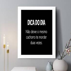Quadro decorativo dica do dia 45x34cm Cor: moldura preta Informações do produto tire todas as suas dúvidas no descritivo abaixo: decoração para quarto, sala, cozinha, escritório, área gourmet e muito mais. Chega de paredes vazias. Medidas - cada peça tem 45x34cm a3 . Material do papel - papel fotográfico brilhante de altíssima resolução acabamento - todos os quadros são acompanhados de uma película de acetato para proteção da imagem. - os quadros são embalados de forma segura com plástico bolha com camada dupla de acordo com o tamanho dos quadros. Garantia - garantia de 3 meses. Meu quadro chegou. Como posso fixá-lo Você precisa apenas de um martelo e um prego, pois os quadros já vão acompanhados de penduradores. Esta é a forma mais indicada. Caso prefira, você pode utilizar uma fita dupla face neste caso, sugerimos de alta qualidade para evitar que descole e seu quadro caia . Como posso limpar meu quadro A limpeza é feita como um móvel comum da sua casa. Apenas um pano seco ou espanador são suficientes para tal