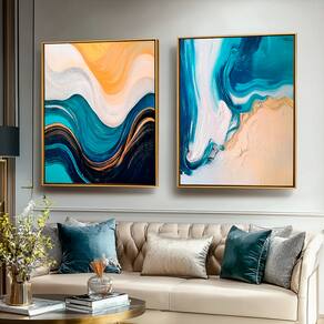 Quadro Decorativo Duo Abstrato Ondas Suave Moldura Dourada e Vidro - 84x54 -
