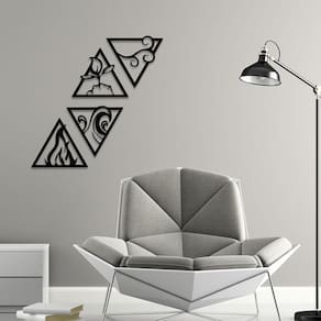Especificações Técnicas: Medidas: 26x 26 cm cada quadro Material: mdf 3mm Cor: preto Tema: natureza Formas de instalação: basta utilizar fitas dupla face Quantidade: 4 unidades Características específicas: cada quadro representa um elemento da natureza: água, fogo, terra e ar.