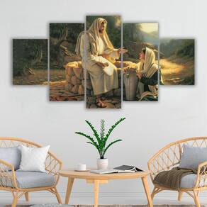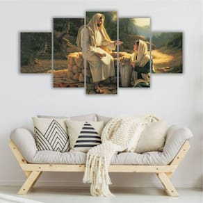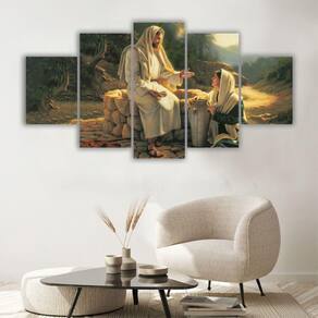Quadro Decorativo Encontro De Jesus Cristo E A Samaritana À Beira Do Poço Kit 5 quadros decorativos mosaicosMaterial:Quadros produzido em mdf- dimensões: Tamanho total do quadro montado na parede: 115cm x 60cm - 1 peça central com 60x22cm- 2 peças intermediárias: 22x50cm- 2 peças laterais: 22x30cm.- deixar espaçamento entre as peças na hora da instalação = 1 cm-informações técnicas: O quadro não precisa de moldura, estão pronto para pendurar na parede. São feitos em adesivos fosco e impressos em alta qualidade. Aplicado em mdf com espessura de 3mm.- instalação: Não é necessário furar a parede para instalação, pois, enviamos fitas 3m com grande poder adesivo para facilitar a instalação. É necessário na hora da instalação posicionar o quadro em 1cm de largura entre eles para melhor qualidade de visualização. Limpe o local que vai ser instalado o quadro com um pano úmido, após secar o local, visualize comoVai ser o alinhamento, e retire a proteção da fita dupla face parte verde da fita e pressioneNo lugar desejado para a fixação.- limpeza após instalação:A limpeza pode ser realizada apenas com um pano seco macio, se desejar pode ser úmido porém sem conter álcool ou produtos químicos.- perguntas:-demais dúvidas estamos à disposição, basta nos chamar no campo mensagens que estamos aqui para melhor atendê-los : Boas compras