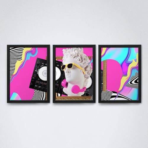 A escultura descolada grega com óculos tons rosa é o ponto focal desses quadros decorativos. Com detalhes minuciosos e cores vibrantes, ela transmite uma sensação de modernidade e descontração ao ambiente. A moldura preta complementa perfeitamente o conjunto, adicionando um toque de elegância e sofisticação.
