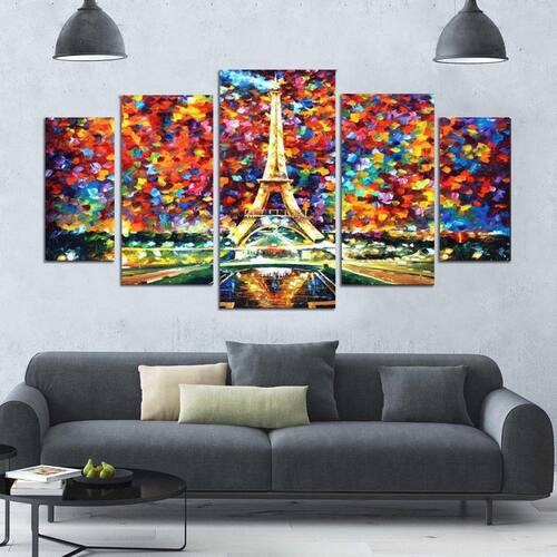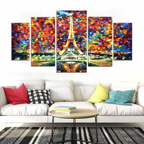 Quadro modelo mosaico 5peças, moderno estilo espatulado Paris França Torre Eiffel Impressão digital em tecido canvas e montado em bastidor de madeira. Impressão nas laterais. Montado em chassi de madeira com os grampos na parte de trás do quadro, Conferindo um melhor acabamento. Kit composto por 5 peças. Cada peça contem 60 x 30, 80 X 40, 100 X 50, 80 X 40, 60 X 30 altura x largura. Espessura 2 cm. Impressão digital em tecido de quadro canvas QUALIDADE 100% Impressão fotográfica com tintas ecologicamente correto, nossa empresa se preocupa com o meio ambiente. As laterais já vão impressa pronto para por na parede sem necessidade de moldura