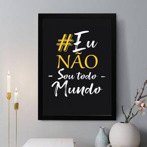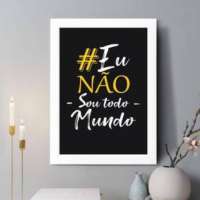 Quadro decorativo eu não sou todo mundo 24x18cm Cor: moldura branca Informações do produto tire todas as suas dúvidas no descritivo abaixo: decoração para quarto, sala, cozinha, escritório, área gourmet e muito mais. Chega de paredes vazias medidas - cada peça tem 24x18cm a5 . Material do papel - papel fotográfico brilhante de altíssima resolução acabamento - todos os quadros são acompanhados de uma película de acetato para proteção da imagem. - os quadros são embalados de forma segura com plástico bolha com camada dupla de acordo com o tamanho dos quadros. - de 3 meses. Meu quadro chegou. Como posso fixá-lo Você precisa apenas de um martelo e um prego, pois os quadros já vão acompanhados de penduradores. Esta é a forma mais indicada. Caso prefira, você pode utilizar uma fita dupla face neste caso, sugerimos de alta qualidade para evitar que descole e seu quadro caia . Como posso limpar meu quadro A limpeza é feita como um móvel comum da sua casa. Apenas um pano seco ou espanador são suficientes para tal Marca: Não Informado Ean: 7892205101896