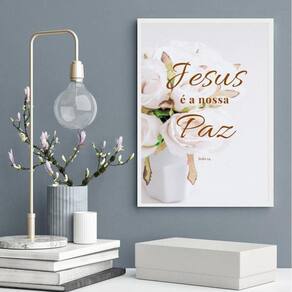 Quadro decorativo evangélico jesus é a nossa paz 45x34cm - com vidro Moldura: madeira branca Informações do produto tire todas as suas dúvidas no descritivo abaixo: decoração para quarto, sala, cozinha, escritório, área gourmet e muito mais. Chega de paredes vazias medidas - cada peça tem 45x34cm a3 . Material do papel - papel fotográfico brilhante de altíssima resolução acabamento - todos os quadros são acompanhados de vidro para proteção da imagem. - moldura em madeira maciça na cor preta ou branca conforme produto escolhido e pendurador . - os quadros são embalados de forma segura com plástico bolha com camada dupla de acordo com o tamanho dos quadros. Garantia - garantia de 3 meses. Meu quadro chegou. Como posso fixá-lo Você precisa apenas de um martelo e um prego, pois os quadros já vão acompanhados de penduradores. Esta é a forma mais indicada. Como posso limpar meu quadro A limpeza é feita como um móvel comum da sua casa. Apenas um pano seco ou espanador são suficientes para tal Ean: 7897582208459