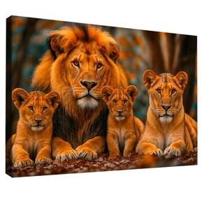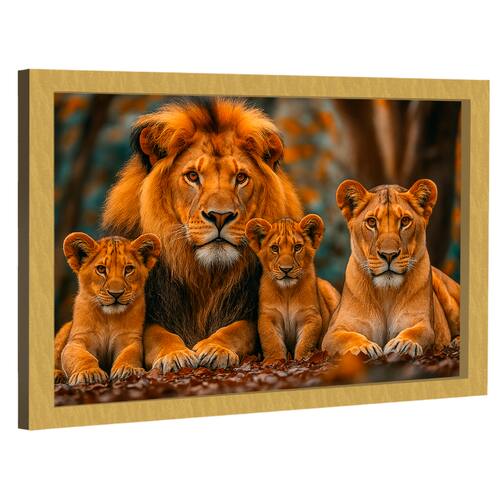 Quadro Decorativo Família De Leões Centrada Moldura Dourada - 84x54cm -