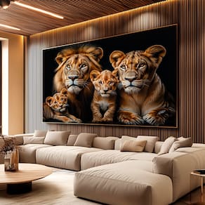 Quadro Decorativo Família de Leões no Preto Moldura Preta - 84x54cm -