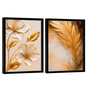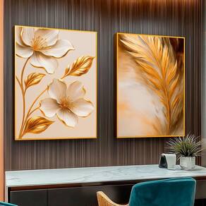 Quadro Decorativo Flor e Folha Dourada Duo Moldura Preta - 84x54cm -