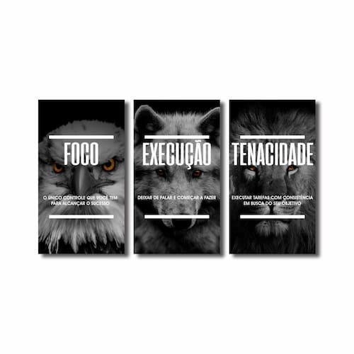Quadro Decorativo Foco Execução Tenacidade Águia Lobo Leão Desenho: Animais Transforme o ambiente da sua casa ou escritório com nosso Quadro Triplo Decorativo de alta qualidade. Este conjunto impressionante é produzido utilizando a mais avançada tecnologia de impressão e corte a laser, garantindo detalhes nítidos e precisos que capturam a essência de qualquer imagem ou design. Características: Impressão de Alta Qualidade: Nossos quadros apresentam uma impressão de alta definição que realça cores vibrantes e detalhes minuciosos, proporcionando uma estética visualmente deslumbrante. Corte a Laser: O corte a laser oferece um acabamento perfeito e preciso, destacando contornos e formas de maneira impecável. Esta técnica também assegura bordas limpas e uniformes, valorizando ainda mais a elegância do quadro. Material Durável: Produzidos em chapa de MDF de 3 mm, os quadros são leves, resistentes e duráveis, garantindo uma longa vida útil e fácil manuseio. O MDF é um material sustentável que proporciona uma superfície lisa e uniforme para a impressão. Design Versátil: Composto por três partes que podem ser dispostas de diversas maneiras, este quadro triplo se adapta a diferentes estilos de decoração, seja moderno, clássico, minimalista ou contemporâneo. Fácil Instalação: Cada quadro vem com fita dupla face prontos para utilizar, permitindo uma instalação rápida e sem complicações. Adicione um toque de sofisticação e personalidade ao seu espaço com o nosso Quadro Triplo Decorativo. Ideal para salas de estar, quartos, escritórios e qualquer ambiente que necessite de um toque artístico e elegante.