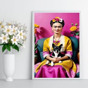 Quadro decorativo frida com cachorrinho 24x18cm Cor: moldura branca Informações do produto tire todas as suas dúvidas no descritivo abaixo: decoração para quarto, sala, cozinha, escritório, área gourmet e muito mais. Chega de paredes vazias medidas - cada peça tem 24x18cm a5 . Material do papel - papel fotográfico brilhante de altíssima resolução acabamento - todos os quadros são acompanhados de uma película de acetato para proteção da imagem. - os quadros são embalados de forma segura com plástico bolha com camada dupla de acordo com o tamanho dos quadros. Garantia - garantia de 3 meses. Meu quadro chegou. Como posso fixá-lo Você precisa apenas de um martelo e um prego, pois os quadros já vão acompanhados de penduradores. Esta é a forma mais indicada. Caso prefira, você pode utilizar uma fita dupla face neste caso, sugerimos de alta qualidade para evitar que descole e seu quadro caia . Como posso limpar meu quadro A limpeza é feita como um móvel comum da sua casa. Apenas um pano seco ou espanador são suficientes para tal