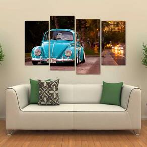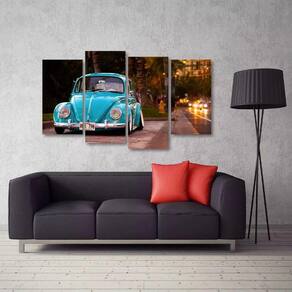 Quadro Decorativo Fusca Azul Vintage Sala Em Tecido 4 Peças