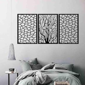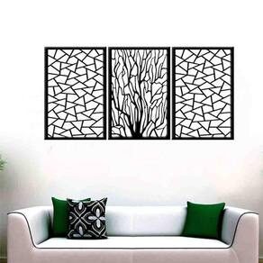 Quadro Decorativo Galhos Geométrico 3Mm Vazado - Mdf TAMANHO & INSTALAÇÃO: Tamanho total: 122cm comprimento X 60cm altura Com espaçamento recomendado de 1 cm entre peças, Peças laterais: 40x60 cm | Peça central: 40x60 cm Espaçamento entre as peças: 1 cm A instalação é bem simples, não será preciso fazer sujeira furando a parede pois utilizamos o método bem prático para instalar, contém fita dupla face 3M no verso do quadro. LIMPEZA DO PRODUTO Para limpeza, utilize apenas um pano umedecido com água sem produtos químicos para garantir a durabilidade. ACABAMENTO Nossos produtos são fabricados em MDF com espessura de 6mm cortados a laser. Desta forma terá um produto com acabamento de alta qualidade. Bordas/laterais serão na cor preta feito com a própria máquina de corte a laser, dando acabamento perfeito. GARANTIA / EMBALAGEM Embalagem reforçada e segura para que receba seu produto em perfeito estado. Garantia de produto de qualidade ou seu dinheiro de volta.