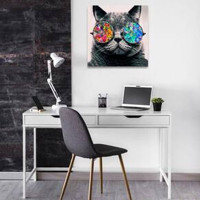 Quadro Decorativo Gato Óculos Colorido Midiapoparte 60X60 Cm Tamanho: 60x60 Quadro decorativo em tecido canvas para salas, quartos, escritórios e home office.Esta composição de quadros decorativos em canvas para ambientes internos é ideal para salas, quartos, escritórios, home office´s, etc. Os Quadros da linha MidiaPopArte são produzidos com impressão profissional em alta definição sobre tecido canvas tecido 100% algodão na gramatura de 270 g/m² esticados em um chassi de madeira reflorestada, tratada e imunizada de 3 a 4 cm de espessura.Nossas impressões de arte têm imagens nítidas em alta resolução. Valorize e decore seu ambiente com nossos lindos quadros decorativos. As laterais da tela são recobertas com o próprio canvas impresso criando a sensação de continuidade de imagem. A tela vai pronta para pendurar na parede bastando utilizar pregos ou parafusos no local desejado.As impressões em tecido canvas tendem uma maior absorção da tinta por parte do tecido, por conta disso, podem ficar mais opacas. Nenhum tecido permite um resultado com uma impressão brilhosa. Exatamente por conta disso, os quadros da linha Canvas MidiaPopArte recebem uma camada de VERNIZ especial para compensar essa opacidade, proporcionando cores mais vivas, maior durabilidade e acabamento diferenciado e exclusivo.Para a fixação do quadro na parede, recomendamos usar parafusos e buchas de 8. Para paredes de gesso ou DryWall usar buchas específicas. Para a garantia do produto, os cuidados abaixo devem ser observados: Tamanho total do quadro: 40x40, 60×60 e 80×80 cm.Tipo de impressão: Impressão digital em altíssima definição em tela canvasAcabamento: Acabamento em verniz UV Estrutura: Chassis na espessura entre 3,5 a 4 cm Embalagem: Plástico bolha e Papelão MicroonduladoMarca: MidiaPopArteCuidados com o produtoEste produto deve ser utilizado apenas em ambientes internos;Para limpeza utilize apenas um pano seco ou espanador;Não exponha o produto em paredes com sinais de umidade ou sobe luz direta do sol;Os objetos ou móveis utilizados nas imagens dos ambientes são apenas ilustrativos e não acompanham o produto;As cores dos quadros podem sofrem variações dependendo da resolução e configuração do seu monitor;As imagens dos quadros nos ambientes são meramente ilustrativas e não configuram a real dimensão do produto;Não nos responsabilizamos pela montagem ou instalação do produto. Considerações importantes1. Se eu não gostar do produto posso devolvê-loA MidiaPopArte garante a devolução do produto dentro de um prazo de 7 dias corridos contados a partir da data de recebimento. 2. Os quadros decorativos em canvas MidiaPopArte acompanham moldurasNão, os quadros são esticados em chassis de madeira reflorestada com a espessura de 3,5 e 4 cm que garantem um acabamento diferenciado e uma estrutura bastante resistente. 3. Como fixar o quadro na paredePara fixar na parede é muito simples. Basta apenas um furo na parede com buchas e parafusos de 8".