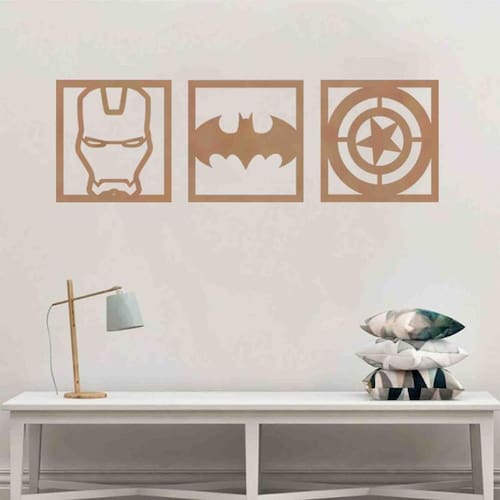 Quadro Decorativo Herois 3Mm Vazado Branco - Mdf Cor: branco Tamanho & instalação: Tamanho total: 92cm comprimento x 30cm altura com espaçamento recomendado de 1 cm entre peças, Peças laterais: 30x30 cm | peça central: 30x30 cm Espaçamento entre as peças: 1 cm A instalação é bem simples, não será preciso fazer sujeira furando a parede pois utilizamos o método bem prático para instalar, contém fita dupla face 3m no verso do quadro.