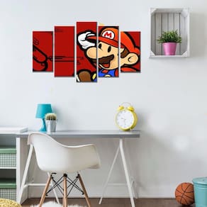 Quadro Decorativo Jogo Super Mario Fundo Vermelho 5 Peças Impresso em tecido canvas e montado em bastidor de madeira. Com grampos por trás do quadro para melhor acabamento. Imagens em alta resolução para um resultado satisfatório ao cliente. 5 peças Dimensão 60 cm altura por 100 cm comprimento ,e a espessura 2 cm Cada peça contem 40x20 , 50 x20 , 60 x20 , 50 x20 , 40 x20 altura x largura . Sobre o tecido canvas O tecido canvas é um material especial para impressão 100% algodão, com uma preparação especial resinada anti mofo. Apropriada para impressões de obras de artes e impressão de fotos tela, muito usadas em exposições em museus. A preparação do tecido encapsula o pigmento da tinta em uma camada protetora proporcionando resistência, o resultado é cores mais vivas e vibrantes sem perder a textura do tecido. É um material ecologicamente correto. Como fixar o quadro na parede O quadro pode ser fixado com buchas e parafusos, Ou grampos de aço que deixa um furo bem menor na parede que as buchas e parafusos Garantimos a qualidade do produto, e a entrega com segurança. Caso o produto chegue com defeito, favor nos comunicar que faremos a troca ou a devolução do pagamento.