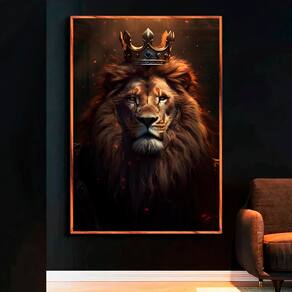 Quadro Decorativo Leão com a Coroa de Rei Moldura Dourada e Vidro - 118x78cm -