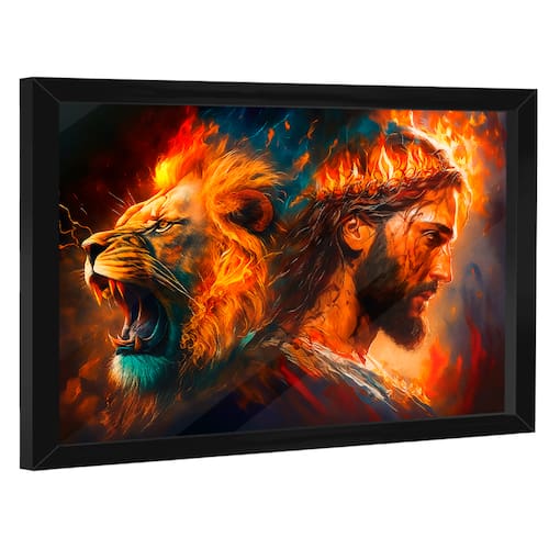 Quadro Decorativo Leão de Judá e Cristo Moldura Preta e Vidro - 180x105cm -