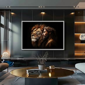 Quadro Decorativo Leão Divino e Jesus Moldura Preta - 84x54cm -