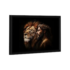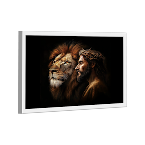 Quadro Decorativo Leão Divino e Jesus Moldura Preta - 118x78cm -