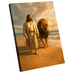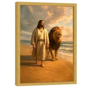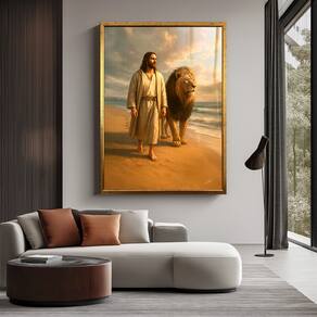 Quadro Decorativo Leão e Jesus Caminhando na Praia Borda Infinita - 84x54cm -