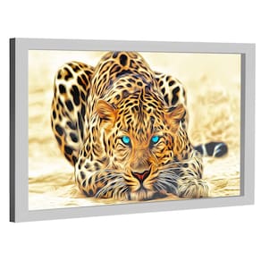 Quadro Decorativo Leopardo Olhos Azuis Moldura Preta e Vidro - 180x105cm -