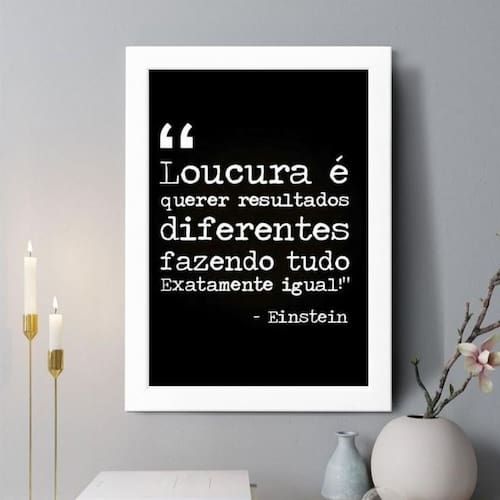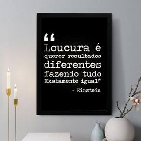 Quadro decorativo loucura - einstein 24x18cm Cor: moldura preta Informações do produto tire todas as suas dúvidas no descritivo abaixo: decoração para quarto, sala, cozinha, escritório, área gourmet e muito mais. Chega de paredes vazias medidas - cada peça tem 24x18cm a5 . Material do papel - papel fotográfico brilhante de altíssima resolução acabamento - todos os quadros são acompanhados de uma película de acetato para proteção da imagem. - os quadros são embalados de forma segura com plástico bolha com camada dupla de acordo com o tamanho dos quadros. Garantia - garantia de 3 meses. Meu quadro chegou. Como posso fixá-lo Você precisa apenas de um martelo e um prego, pois os quadros já vão acompanhados de penduradores. Esta é a forma mais indicada. Caso prefira, você pode utilizar uma fita dupla face neste caso, sugerimos de alta qualidade para evitar que descole e seu quadro caia . Como posso limpar meu quadro A limpeza é feita como um móvel comum da sua casa. Apenas um pano seco ou espanador são suficientes para tal