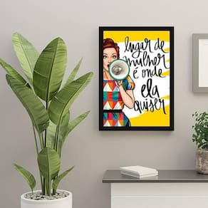 O Quadro Decorativo Lugar De Mulher É Onde Ela Quiser da Quadros On-Line é uma excelente opção para decorar seu ambiente, tornando-o mais aconchegante, bonito e com muito estilo. Para facilitar na instalação, o quadro já vem com pendurador que pode ser removido com facilidade. O quadro é produzido com papel fotográfico brilhante de alta resolução e acompanha uma película de acetato para proteção da imagem. Além disso, vem com moldura em madeira maciça e pendurador móvel que pode ser retirado facilmente caso deseje fixar com fita dupla face. Características: - Quadro com 34x23cm com moldura - Moldura em madeira maciça preta - Produzido em papel fotográfico brilhante - Acompanha película de acetato Especificações Técnicas Produto: Quadro Decorativo Marca: Quadros On-Line Modelo: Lugar De Mulher É Onde Ela Quiser Material: Papel Fotográfico Acabamento: Brilhante Acompanha: Película de acetato para proteção Instalação: Acompanha pendurador móvel Tamanho unidade: 34 x 23 cm : 3 meses Limpeza e conservação Para manter seus quadros sempre limpos e bem conservados a limpeza deve ser feita como em um móvel comum da sua casa. Apenas um pano seco ou um espanador já é suficiente para retirar o pó que pode se acumular nos quadros. Marca: Não Informado