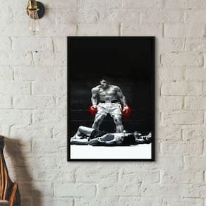 Quadro decorativo luta boxe ali 33x24cm - com vidro Moldura: madeira preta Informações do produto tire todas as suas dúvidas no descritivo abaixo: decoração para quarto, sala, cozinha, escritório, área gourmet e muito mais. Chega de paredes vazias medidas - cada peça tem 33x24cm a4 . Material do papel - papel fotográfico brilhante de altíssima resolução acabamento - todos os quadros são acompanhados de vidro para proteção da imagem. - moldura em madeira maciça na cor preta e pendurador . - os quadros são embalados de forma segura com plástico bolha com camada dupla de acordo com o tamanho dos quadros. - de 3 meses. Meu quadro chegou. Como posso fixá-lo Você precisa apenas de um martelo e um prego, pois os quadros já vão acompanhados de penduradores. Esta é a forma mais indicada. Como posso limpar meu quadro A limpeza é feita como um móvel comum da sua casa. Apenas um pano seco ou espanador são suficientes para tal Ean: 7895142250924