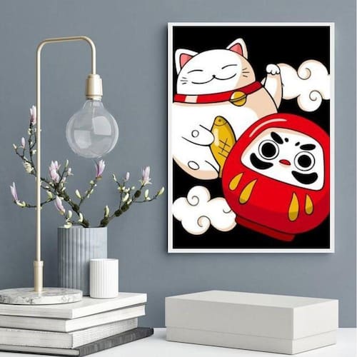 Quadro decorativo maneki neko e daruma 24x18cm - com vidro Moldura: madeira branca Informações do produto tire todas as suas dúvidas no descritivo abaixo: decoração para quarto, sala, cozinha, escritório, área gourmet e muito mais. Chega de paredes vazias medidas - cada peça tem 24x18cm a5 . Material do papel - papel fotográfico brilhante de altíssima resolução acabamento - todos os quadros são acompanhados de vidro para proteção da imagem. - moldura em madeira maciça na cor preta ou branca conforme produto escolhido e pendurador . - os quadros são embalados de forma segura com plástico bolha com camada dupla de acordo com o tamanho dos quadros. Garantia - garantia de 3 meses. Meu quadro chegou. Como posso fixá-lo Você precisa apenas de um martelo e um prego, pois os quadros já vão acompanhados de penduradores. Esta é a forma mais indicada. Como posso limpar meu quadro A limpeza é feita como um móvel comum da sua casa. Apenas um pano seco ou espanador são suficientes para tal Ean: 7899986542894