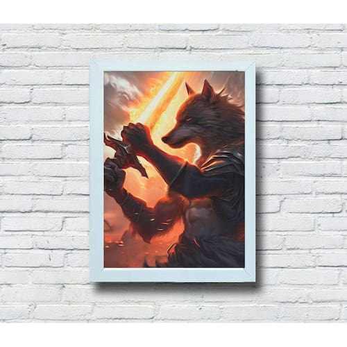Celebre a arte em sua forma mais vibrante com nosso quadro decorativo de alta qualidade feito em MDF. Escolha entre moldura ou sem moldura, e permita que a impressão excepcional e a arte exclusiva do "Lobo com Espada Flamejante" se combinem para um impacto impressionante. Marca: I Love Be Nerd
