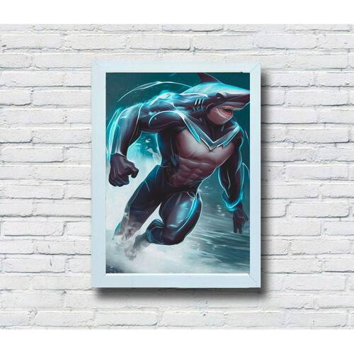 Nossos quadros decorativos de alta qualidade feitos em MDF são projetados para impressionar. Com opções de moldura ou sem moldura, veja como as cores vibrantes e a arte exclusiva do "Shark Hero" ganham vida graças à nossa impressão excepcional.