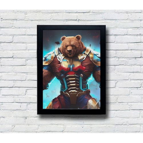 Adicione um elemento de distinção com nosso quadro decorativo de alta qualidade feito em MDF. Cores vibrantes e arte exclusiva do "Urso Guerreiro" ganham vida através da nossa impressão premium, com escolha entre moldura ou sem moldura.