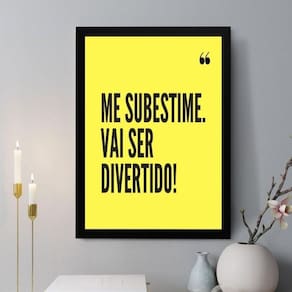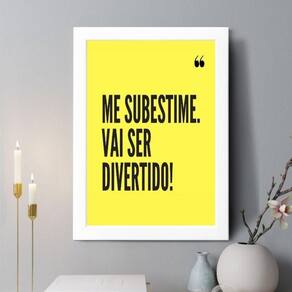 Quadro decorativo me subestime, vai ser divertido 45x34cm - com vidro Cor: moldura preta Informações do produto tire todas as suas dúvidas no descritivo abaixo: decoração para quarto, sala, cozinha, escritório, área gourmet e muito mais. Chega de paredes vazias medidas - cada peça tem 45x34cm a3 . Material do papel - papel fotográfico brilhante de altíssima resolução acabamento - todos os quadros são acompanhados de vidro para proteção da imagem. - moldura em madeira maciça na cor preta ou branca conforme produto escolhido e pendurador . - os quadros são embalados de forma segura com plástico bolha com camada dupla de acordo com o tamanho dos quadros. Garantia - garantia de 3 meses. Meu quadro chegou. Como posso fixá-lo Você precisa apenas de um martelo e um prego, pois os quadros já vão acompanhados de penduradores. Esta é a forma mais indicada. Como posso limpar meu quadro A limpeza é feita como um móvel comum da sua casa. Apenas um pano seco ou espanador são suficientes para tal