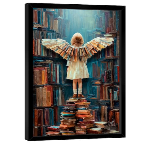 Quadro Decorativo Menina com Asas de Livro Moldura Preta - 180x105cm -