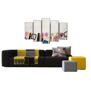 Quadro Decorativo Mosaico 5 Peças Mod1214 Maquiagens Tamanho & instalação Tamanho total: 105cm comprimento x 60cm altura 1 peça central: 20x60 cm 2 peças laterais: 20x50 cm 2 peças laterais 20x40 cm Espaçamento entre as peças: 2 cm A instalação é bem simples, pois acompanha suporte para fixação em pregos ou parafusos, conforme queira. Para limpeza, utilize apenas um pano umedecido com água sem produtos químicos para garantir a durabilidade. Impressão & acabamento Nossos quadros são impressos em adesivo alto brilho, aplicado em mdf com espessura de 6mm. Não necessita de moldura, pois o acabamento das bordas laterais é feito em preto fosco no mdf - leia a descrição, possivelmente todas suas dúvidas estão nela. Decore sua sala, quarto, cozinha ou presenteie seu amigo com o quadro mosaico 5 peças mdf 6mm. Sua casa nunca mais será a mesma, coloque estilo onde você passará seus melhores momentos. Sua casa é seu espaço, seu aconchego, e quem olha pra ele tem que saber que ele é seu Sendo assim a eco decor criou pra você uma enorme variedade em quadros decorativos de cores e desenhos que seguem as últimas tendências de decoração. Decore seu espaço, seja com quadros para sala, quadros para área gourmet, quadros para quarto, quadros infantis, aqui você encontrará o que deseja artes descoladas, exclusivas e a preços acessíveis. Esperamos que se sinta à vontade e encontre aqui o seu estilo, e ao olhar pra o seu ambiente, seja ele qual for - possa dizer: agora meu ambiente está completo Material papel - adesivo vinílico fosco premium Tipo de impressão - impressão fotográfica em plotter digital de alta resolução com técnologia latex hp - a melhor do mercado em durabilidade. Finalização e acabamento - os quadros acompanham traves de mdf6mm para fixação na parede, basta apoiá-las sob os pregos ou parafusos não acompanha pregos ou parafusos Marca: Não Informado