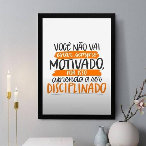 Quadro decorativo motivação e disciplina 33x24cm Cor: moldura preta Informações do produto tire todas as suas dúvidas no descritivo abaixo: decoração para quarto, sala, cozinha, escritório, área gourmet e muito mais. Chega de paredes vazias medidas - cada peça tem 33x24cm a4 . Material do papel - papel fotográfico brilhante de altíssima resolução acabamento - todos os quadros são acompanhados de uma película de acetato para proteção da imagem. - os quadros são embalados de forma segura com plástico bolha com camada dupla de acordo com o tamanho dos quadros. Garantia - garantia de 3 meses. Meu quadro chegou. Como posso fixá-lo Você precisa apenas de um martelo e um prego, pois os quadros já vão acompanhados de penduradores. Esta é a forma mais indicada. Caso prefira, você pode utilizar uma fita dupla face neste caso, sugerimos de alta qualidade para evitar que descole e seu quadro caia . Como posso limpar meu quadro A limpeza é feita como um móvel comum da sua casa. Apenas um pano seco ou espanador são suficientes para tal