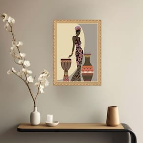 Quadro decorativo mulher negra tambor e vaso 33x24cm - com vidro Cor: moldura branca Informações do produto tire todas as suas dúvidas no descritivo abaixo: decoração para quarto, sala, cozinha, escritório, área gourmet e muito mais. Chega de paredes vazias medidas - cada peça tem 33x24cm a4 . Material do papel - papel fotográfico brilhante de altíssima resolução acabamento - todos os quadros são acompanhados de vidro para proteção da imagem. - moldura em madeira maciça na cor preta ou branca conforme produto escolhido e pendurador . - os quadros são embalados de forma segura com plástico bolha com camada dupla de acordo com o tamanho dos quadros. Garantia - garantia de 3 meses. Meu quadro chegou. Como posso fixá-lo Você precisa apenas de um martelo e um prego, pois os quadros já vão acompanhados de penduradores. Esta é a forma mais indicada. Como posso limpar meu quadro A limpeza é feita como um móvel comum da sua casa. Apenas um pano seco ou espanador são suficientes para tal