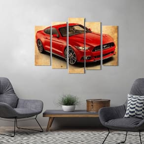 Quadro Decorativo Mustang Vintage Vermelho 5 Peças Para Sala As paredes ganham cor e vida com quadros e painéis decorativos. Um quadro super grande combina com qualquer ambiente. Impresso em (tecido canvas) semelhante o tecido de quadros de pintura E montado em bastidor de madeira. Com grampos por trás do quadro para melhor acabamento. Dimensão total do quadro neste anuncio 70cm altura por 100cm comprimento ,e a espessura 2 cm. Medidas de cada peça: 20x50 / 20x60 / 20x70 / 20x60 /20x50