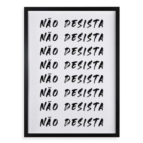 Quadro decorativo não desista 33x24cm Cor: moldura branca Informações do produto tire todas as suas dúvidas no descritivo abaixo: decoração para quarto, sala, cozinha, escritório, área gourmet e muito mais. Chega de paredes vazias medidas - cada peça tem 33x24cm a4 . Material do papel - papel fotográfico brilhante de altíssima resolução acabamento - todos os quadros são acompanhados de uma película de acetato para proteção da imagem. - os quadros são embalados de forma segura com plástico bolha com camada dupla de acordo com o tamanho dos quadros. - de 3 meses. Meu quadro chegou. Como posso fixá-lo Você precisa apenas de um martelo e um prego, pois os quadros já vão acompanhados de penduradores. Esta é a forma mais indicada. Caso prefira, você pode utilizar uma fita dupla face neste caso, sugerimos de alta qualidade para evitar que descole e seu quadro caia . Como posso limpar meu quadro A limpeza é feita como um móvel comum da sua casa. Apenas um pano seco ou espanador são suficientes para tal Marca: Não Informado
