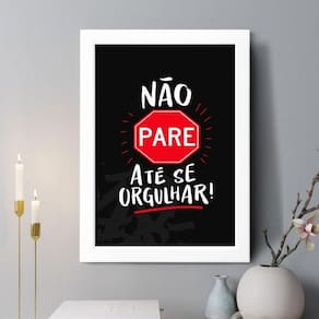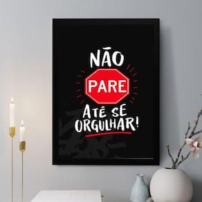 Quadro decorativo não pare até se orgulhar 24x18cm Cor: moldura branca Informações do produto tire todas as suas dúvidas no descritivo abaixo: decoração para quarto, sala, cozinha, escritório, área gourmet e muito mais. Chega de paredes vazias medidas - cada peça tem 24x18cm a5 . Material do papel - papel fotográfico brilhante de altíssima resolução acabamento - todos os quadros são acompanhados de uma película de acetato para proteção da imagem. - os quadros são embalados de forma segura com plástico bolha com camada dupla de acordo com o tamanho dos quadros. Garantia - garantia de 3 meses. Meu quadro chegou. Como posso fixá-lo Você precisa apenas de um martelo e um prego, pois os quadros já vão acompanhados de penduradores. Esta é a forma mais indicada. Caso prefira, você pode utilizar uma fita dupla face neste caso, sugerimos de alta qualidade para evitar que descole e seu quadro caia . Como posso limpar meu quadro A limpeza é feita como um móvel comum da sua casa. Apenas um pano seco ou espanador são suficientes para tal