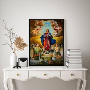 Quadro decorativo nossa senhora desatadora dos nós 45x34cm - com vidro Moldura: madeira branca Informações do produto tire todas as suas dúvidas no descritivo abaixo: decoração para quarto, sala, cozinha, escritório, área gourmet e muito mais. Chega de paredes vazias medidas - cada peça tem 45x34cm a3 . Material do papel - papel fotográfico brilhante de altíssima resolução acabamento - todos os quadros são acompanhados de vidro para proteção da imagem. - moldura em madeira maciça na cor preta e pendurador . - os quadros são embalados de forma segura com plástico bolha com camada dupla de acordo com o tamanho dos quadros. Garantia - garantia de 3 meses. Meu quadro chegou. Como posso fixá-lo Você precisa apenas de um martelo e um prego, pois os quadros já vão acompanhados de penduradores. Esta é a forma mais indicada. Como posso limpar meu quadro A limpeza é feita como um móvel comum da sua casa. Apenas um pano seco ou espanador são suficientes para tal Ean: 7892472930908