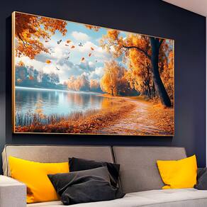 Quadro Decorativo Paisagem de Outono Cênica Moldura Dourada - 84x54cm -