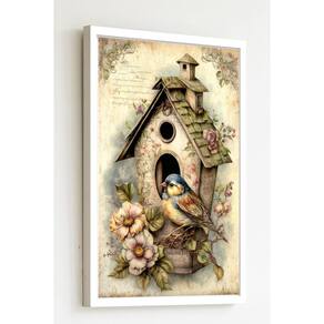 Quadro Decorativo Pássaro Casinha Vintage - 70x50cm - Cor: Moldura Preta