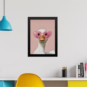 Quadro decorativo patinho com óculos de coração 24x18cm - com vidro Cor: moldura preta Informações do produto tire todas as suas dúvidas no descritivo abaixo: decoração para quarto, sala, cozinha, escritório, área gourmet e muito mais. Chega de paredes vazias medidas - cada peça tem 24x18cm a5 . Material do papel - papel fotográfico brilhante de altíssima resolução acabamento - todos os quadros são acompanhados de vidro para proteção da imagem. - moldura em madeira maciça na cor preta ou branca conforme produto escolhido e pendurador . - os quadros são embalados de forma segura com plástico bolha com camada dupla de acordo com o tamanho dos quadros. - de 3 meses. Meu quadro chegou. Como posso fixá-lo Você precisa apenas de um martelo e um prego, pois os quadros já vão acompanhados de penduradores. Esta é a forma mais indicada. Como posso limpar meu quadro A limpeza é feita como um móvel comum da sua casa. Apenas um pano seco ou espanador são suficientes para tal Marca: Não Informado Ean: 7908991734788