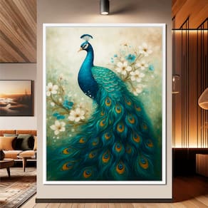 Quadro Decorativo Pavão Estilo Pintura Moldura Preta e Vidro - 84x54cm -