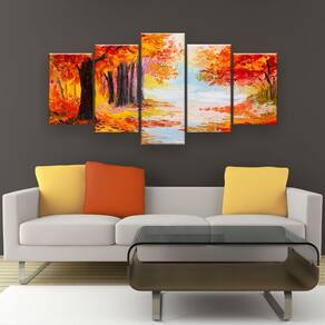 Quadro Decorativo Pintura Passagem De Outono Folhas Laranjas 129X61 5 Peças Tamanho total: 129cm comprimento X 61cm altura Peças menores: 25x40 cm Peças médias: 25x50 cm Peça central: 25x61 cm Espaçamento entre as peças: 1 cm A instalação é bem simples, pois utilizamos o método tradicional, pendurado com preguinhos. Acompanha um gabarito para facilitar a aplicação. A aplicação com o gabarito que enviamos é prática e rápida. Para limpeza, utilize apenas um pano umedecido com água sem produtos químicos para garantir a durabilidade. Nossos quadros são impressos em vinil semi-fosco de alta qualidade, aplicado em Madeira MDF com espessura de 6mm + base de madeira MDF de 9mm Total 15mm Não necessita de moldura, pois o acabamento das bordas/laterais é feito com a própria imagem impressa. Impressão em alta qualidade. Imagens em HD Alta Definição Mínimo de 12000 pixels. Marca: Não Informado Ean: 7898667104741