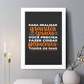 Quadro decorativo para realizar grandes coisas 24x18cm - com vidro Cor: moldura preta Informações do produto tire todas as suas dúvidas no descritivo abaixo: decoração para quarto, sala, cozinha, escritório, área gourmet e muito mais. Chega de paredes vazias medidas - cada peça tem 24x18cm a5 . Material do papel - papel fotográfico brilhante de altíssima resolução acabamento - todos os quadros são acompanhados de vidro para proteção da imagem. - moldura em madeira maciça na cor preta ou branca conforme produto escolhido e pendurador . - os quadros são embalados de forma segura com plástico bolha com camada dupla de acordo com o tamanho dos quadros. Garantia - garantia de 3 meses. Meu quadro chegou. Como posso fixá-lo Você precisa apenas de um martelo e um prego, pois os quadros já vão acompanhados de penduradores. Esta é a forma mais indicada. Como posso limpar meu quadro A limpeza é feita como um móvel comum da sua casa. Apenas um pano seco ou espanador são suficientes para tal