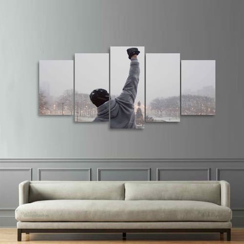 Quadro decorativo Rocky Balboa Mosaico 5 Peças Dimensões do Produto: Tamanho total do produto: 125x60 cm Comprimento x Altura 02 Peças menores: 25x40 cm 02 Peças Médias: 25x50 cm 01 Peça Central: 25x60 cm. Espaçamento entre as peças de 1 cm - Tamanho total com espaçamentos 129x60 cm. Espessura do produto - 9 mm
