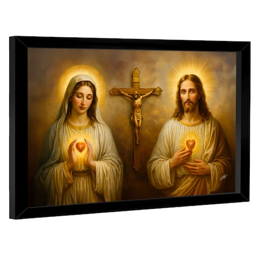 Quadro Decorativo Sagrado Coração de Jesus e Maria Moldura Preta - 180x105cm -