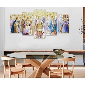 Quadro Decorativo Sala Quarto Escritório Conselho Arcanjos Os quadros decorativos são uma tendência e excelente ideia para quem desejar realmente mudar o visual do seu ambiente, deixando ele com a sua cara. São Utilizados para decorar vários ambientes seja um comércio, sua sala, quarto, área de lazer ou escritório, são lindos, leves e fáceis de instalar. Também pode quebrar aquele galho tampando aquelas pequenas imperfeições indesejadas da parede, com um toque super elegante. Decorar o seu ambiente é sempre um momento muito especial. Características do Produto: Tamanho total: 130cm comprimento X 63cm altura Peças menores: 25x40 cm | Peças médias: 25x51 cm | Peça central: 25x63 cm Espaçamento entre as peças: 1 cm a 2 cm Espessura do produto - 2 CM Quadro pronto para pendurar no local desejado. Material e Acabamentos: Tela em Tecido com impressão digital ecológica, de alta tecnologia, Atóxica e sem cheiro, proporcionando imagens de alta qualidade e durabilidade. Bordas com a extensão da própria imagem nas laterais, sendo uma tela painel. Tecido esticado no chassi de madeira e grampeado no verso, com suportes triangulares para a fixação. Um pouco mais sobre o Tecido O tecido é sintético fechado, sua flexibilidade evita que a impressão fique com aparência pigmentada, caso o material seja esticado. É muito utilizado em museus, exposições de arte, eventos, na identificação e principalmente Na decoração de ambientes. Como fixar no local: Fixação feita de forma tradicional, basta colocar dois parafusos ou dois pregos de acordo com os engates do quadro, Deixando espaçamento entre as peças de 1,5 CM ou até no máximo 2,5 CM. Limpeza após fixação: Para a limpeza basta apenas um espanador ou pano macio, sem conter elementos químicos. Objetos/móveis ilustrativos da imagens não inclusos somente o quadro. O Produto pode de ocorrer de ter uma leve diferença de tom de cor da que esta no monitor do seu computador. O Produto é produzido e postado em até 3 dias úteis após a confirmação do pagamento. Ean: 7899026400177