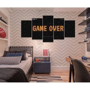 Quadro Decorativo Sala Quarto Escritório Game Over Os quadros decorativos são uma tendência e excelente ideia para quem desejar realmente mudar o visual do seu ambiente, deixando ele com a sua cara. São Utilizados para decorar vários ambientes seja um comércio, sua sala, quarto, área de lazer ou escritório, são lindos, leves e fáceis de instalar. Também pode quebrar aquele galho tampando aquelas pequenas imperfeições indesejadas da parede, com um toque super elegante. Decorar o seu ambiente é sempre um momento muito especial. Características do Produto: Tamanho total: 130cm comprimento X 63cm altura Peças menores: 25x40 cm | Peças médias: 25x51 cm | Peça central: 25x63 cm Espaçamento entre as peças: 1 cm a 2 cm Espessura do produto - 2 CM Quadro pronto para pendurar no local desejado. Material e Acabamentos: Tela em Tecido com impressão digital ecológica, de alta tecnologia, Atóxica e sem cheiro, proporcionando imagens de alta qualidade e durabilidade. Bordas com a extensão da própria imagem nas laterais, sendo uma tela painel. Tecido esticado no chassi de madeira e grampeado no verso, com suportes triangulares para a fixação. Um pouco mais sobre o Tecido O tecido é sintético fechado, sua flexibilidade evita que a impressão fique com aparência pigmentada, caso o material seja esticado. É muito utilizado em museus, exposições de arte, eventos, na identificação e principalmente Na decoração de ambientes. Como fixar no local: Fixação feita de forma tradicional, basta colocar dois parafusos ou dois pregos de acordo com os engates do quadro, Deixando espaçamento entre as peças de 1,5 CM ou até no máximo 2,5 CM. Limpeza após fixação: Para a limpeza basta apenas um espanador ou pano macio, sem conter elementos químicos. Objetos/móveis ilustrativos da imagens não inclusos somente o quadro. O Produto pode de ocorrer de ter uma leve diferença de tom de cor da que esta no monitor do seu computador. O Produto é produzido e postado em até 3 dias úteis após a confirmação do pagamento. Ean: 7891916113471